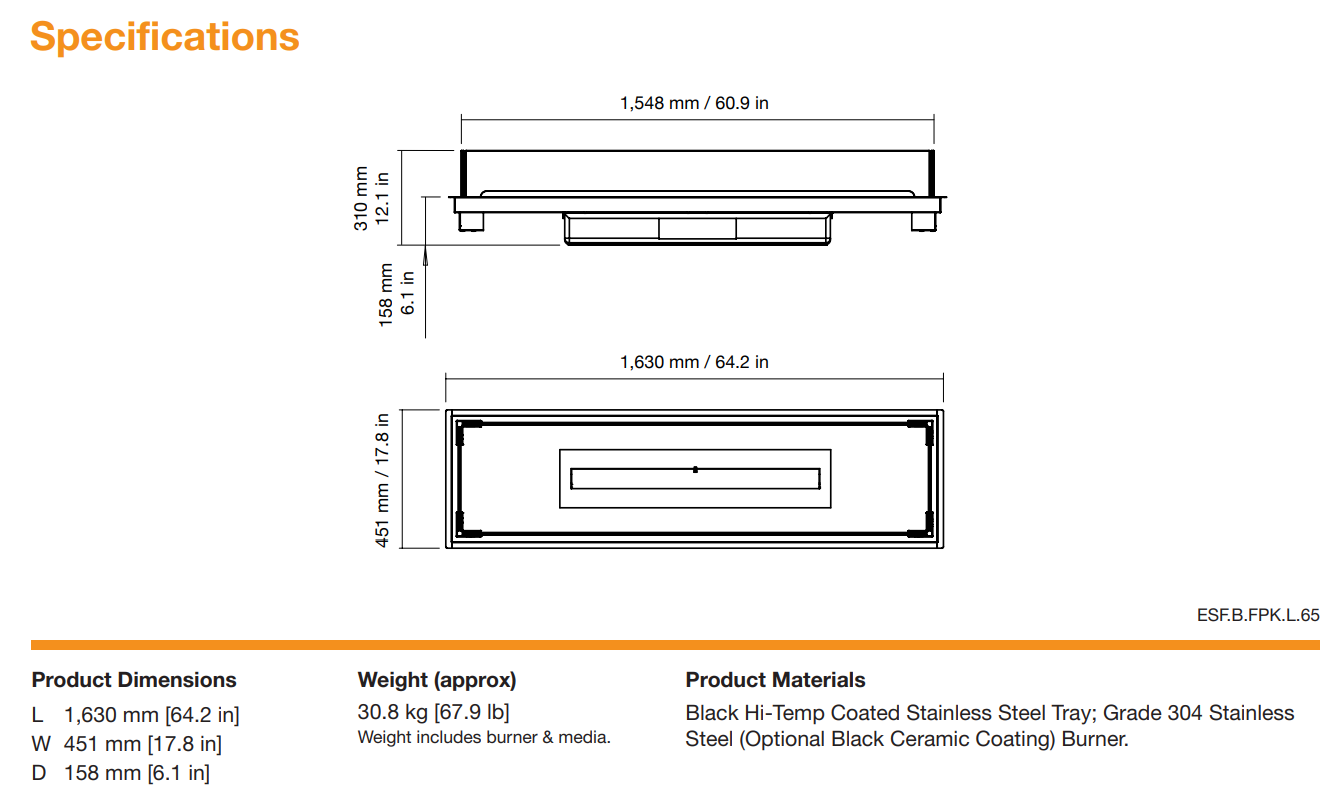 Craft the perfect custom fire pit for your space by simply integrating our Linear 65 Fire Pit Kit into a non-combustible setting such as stone countertops, concrete surfaces, brick, or tiled tops. Simply drop in the metal tray housing the stainless steel burner and decorative black glass charcoal for a stunning indoor or outdoor fire feature. An optional toughened glass fire screen surround further enhances the elegant look for breezy environments without compromising the view.